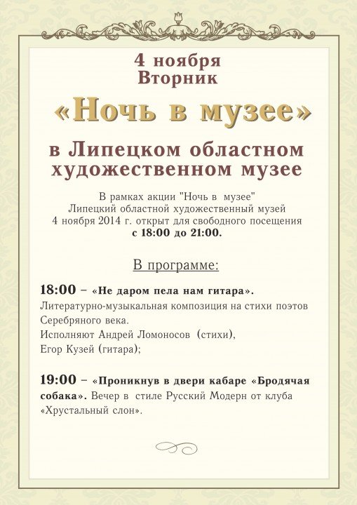 Клуб культурного развития «Хрустальный слон» приглашает липчан познакомиться с историей культового кабаре «Бродячая собака» и воссоздать его атмосферу в реальном времени. Гости смогут услышать и сами процитировать стихотворения любимых поэтов Серебряного века, представить на суд публики собственное творчество, научиться танцам начала двадцатого века. Для посетителей желательно соблюдение дресс-кода, выдержанного в стиле эпохи модерна.