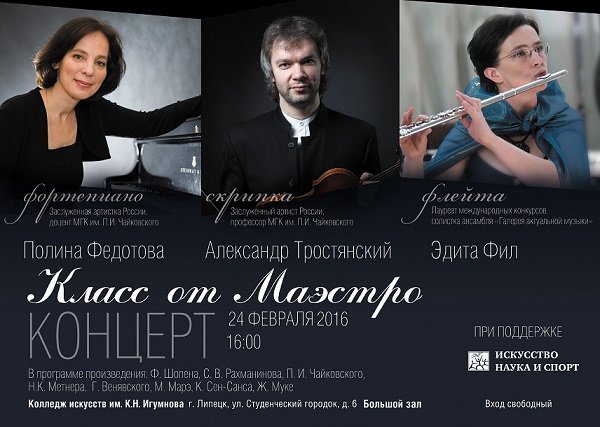 24 февраля в 16:00 в колледже искусств им. К.Н. Игумнова в исполнении П. Федотовой, Э. Фил и А. Тростянского пройдет бесплатный концерт для всех участников мастер-классов - учащихся и педагогов музыкальных учреждений Липецкой, Воронежской и Тамбовской областей. Прозвучит музыка Ф. Шопена, С.В. Рахманинова, П.И. Чайковского, Н.К. Метнера, М. Марэ и других выдающихся композиторов.