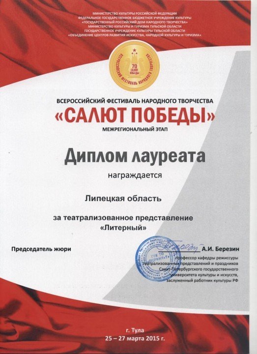 С 25 по 27 марта в г. Туле проходил межрегиональный этап Всероссийского фестиваля народного творчества «Салют Победы», посвященного 70-летию Победы в Великой Отечественной войне 1941 - 1945 гг. Творческая делегация Липецкой области завоевала звание лауреата фестиваля за театрализованное представление «Литерный».