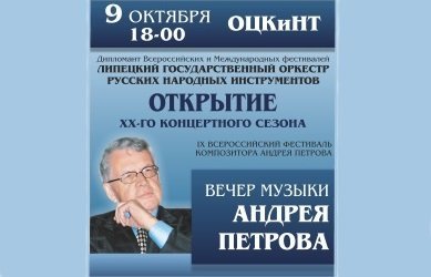 Открытие юбилейного XX-го концертного сезона Липецкого государственного оркестра русских народных инструментов с программой «Вечер музыки Андрея Петрова» состоится в Областном Центре культуры и народного творчества 9 октября в 18.00.
