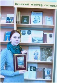 Выставка предлагает произведения автора, критику его творчества, биографические факты. Обращает на себя внимание необычная, не имеющая аналогов в нашем литературоведении книга «Знакомьтесь: М. Е. Салтыков-Щедрин», созданная коллективом авторов. Издание представляет собой своеобразный справочник и путеводитель по сатирическому наследию писателя. Прочитав эту книгу, вдумчивый читатель обязательно захочет побольше узнать о жизни и творчестве гениального сатирика. Как формировать нравственные понятия у школьников на примере изучения отдельных произведений писателя, рассказывают публикации журнала «Литература в школе», представленные на выставке. В монографиях, размещенных на полках, литературные критики раскрывают своеобразие сатирических образов, созданных Салтыковым-Щедриным, своеобразие сюжетов и конфликтов его произведений.