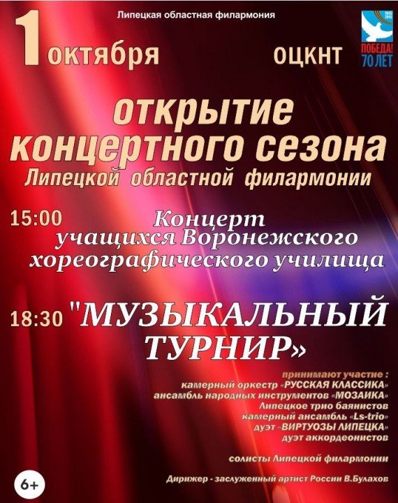 Вечером этого же дня там же, на сцене ОЦКНТ, состоится торжественное открытие концертного сезона "Русская филармония". В программе - липецкое трио баянистов, "Виртуозы Липецка", дуэт аккордеонистов, ансамбль народных инструментов "Мозаика", L-S Trio. Начало в 18.30.