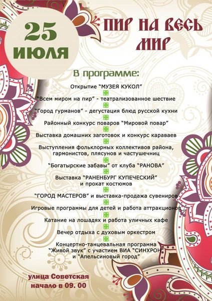 Центром событий с 9.00 станет улица Советская. В рамках праздника откроется музей кукол, состоится театрализованное шествие и дегустация блюд русской кухни. Также намечен районный конкурс поваров и выставка домашних заготовок.