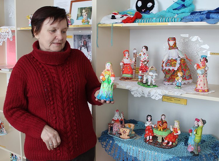 В комнате также можно увидеть картины, созданные местными художниками, керамические игрушки мастера Татьяны Тереховой, работы из бисера Анны Кузьменковой, переданные в досуговый центр ее родственниками, вышивка Татьяны Небольсиной, предметы лозоплетения Олега Томилина и множество других предметов народного творчества селян.