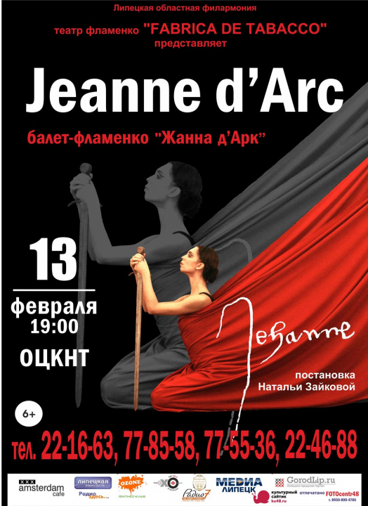 По приглашению Липецкой областной филармонии 13 февраля в 19:00 на сцене ОЦКНТ выступит театр фламенко «Fabrica de Tabaco» с оригинальной постановкой балета-фламенко «Жанна д'Арк». Сочетание многообразия фламенко с выразительной пластикой модерна, проникновенная музыка и вокал, нестандартные сценические решения - главные составляющие балета «Жанна д'Арк». Режиссером-постановщиком спектакля, а также исполнительницей главной роли стала Наталья Зайкова, танцовщица и хореограф фламенко, обладательница многочисленных премий и наград. Напомним, что Липецкая филармония выступала организатором гастролей театра Натальи Зайковой в прошлом концертном сезоне с постановкой балета «Фрида», имевшей огромный успех у Липецких зрителей.