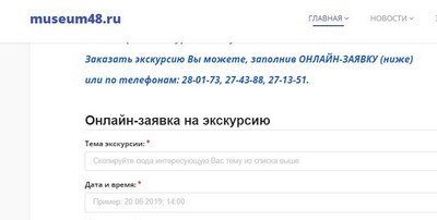 Новая функция "ОНЛАЙН-ЗАЯВКА" на экскурсию доступна на нашем сайте по ссылке https://www.museum48.ru/index.php/homepage/uslugi/ekskursii