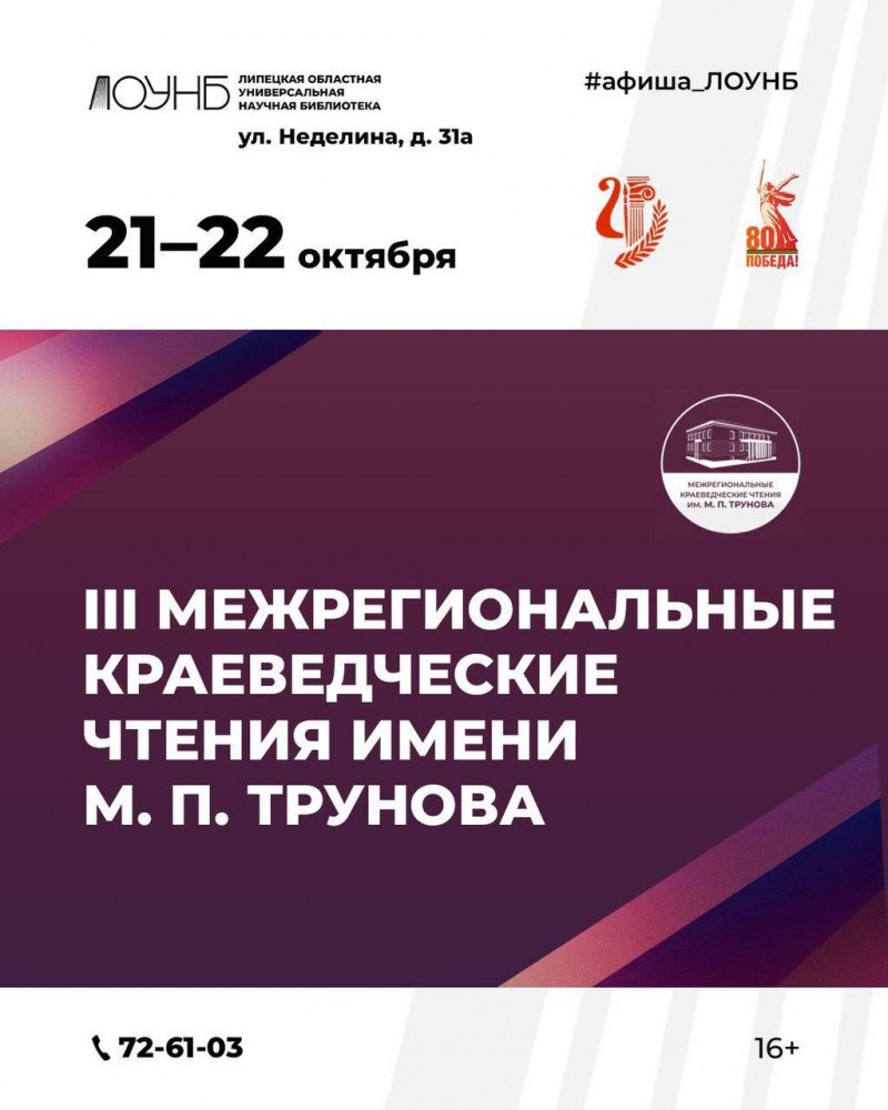Стартовала регистрация на III Межрегиональные краеведческие чтения имени М. П. Трунова! 21–22 октября Липецкая областная универсальная научная библиотека приглашает ученых, преподавателей, краеведов, исследователей, а также специалистов библиотек, музеев и архивов на масштабное событие, посвященное: