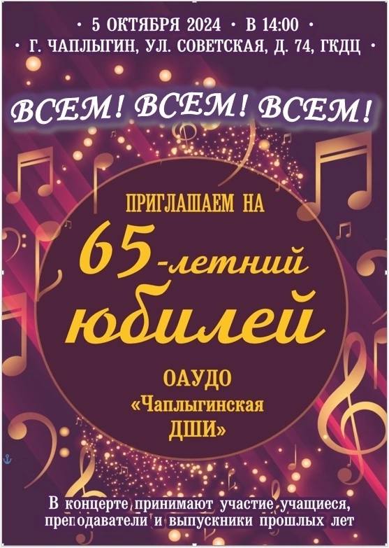 С радостью приглашаем вас на празднование 65-летнего юбилея ОАУДО «Чаплыгинская ДШИ»!
