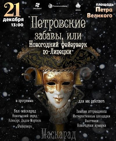 Фестиваль «Петровские забавы или Новогодний фейерверк по-Липецки» - главное новогоднее событие, создающее неповторимую атмосферу в городе. В этом году мероприятие состоится 21 декабря в 13.00 на пл. Петра Великого, главной темой его станет новогодний маскарад.