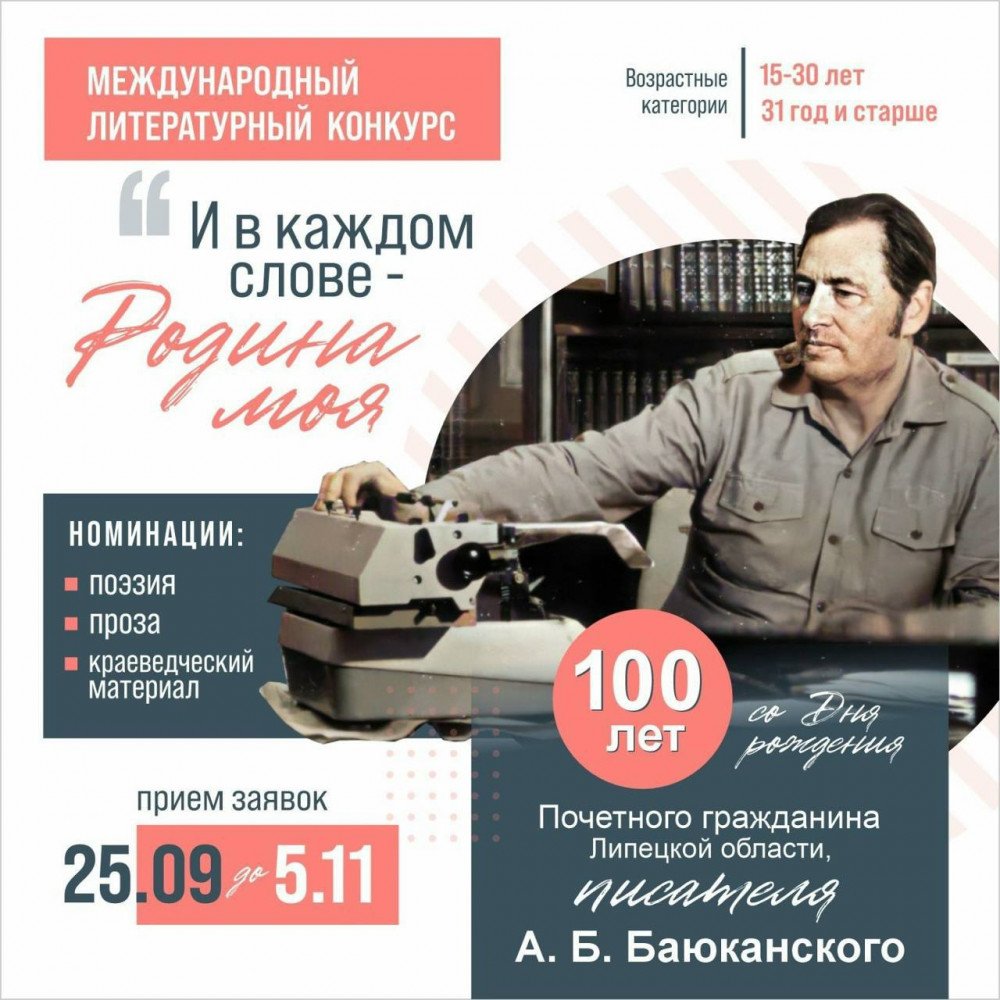 Военно-историческая библиотека имени Героя Советского Союза М.В. Водопьянова объявляет о старте международного литературного конкурса «И в каждом слове — Родина моя». Мероприятие приурочено к 100-летию со дня рождения Почетного гражданина Липецкой области, писателя А.Б. Баюканского.Сроки проведения конкурса: