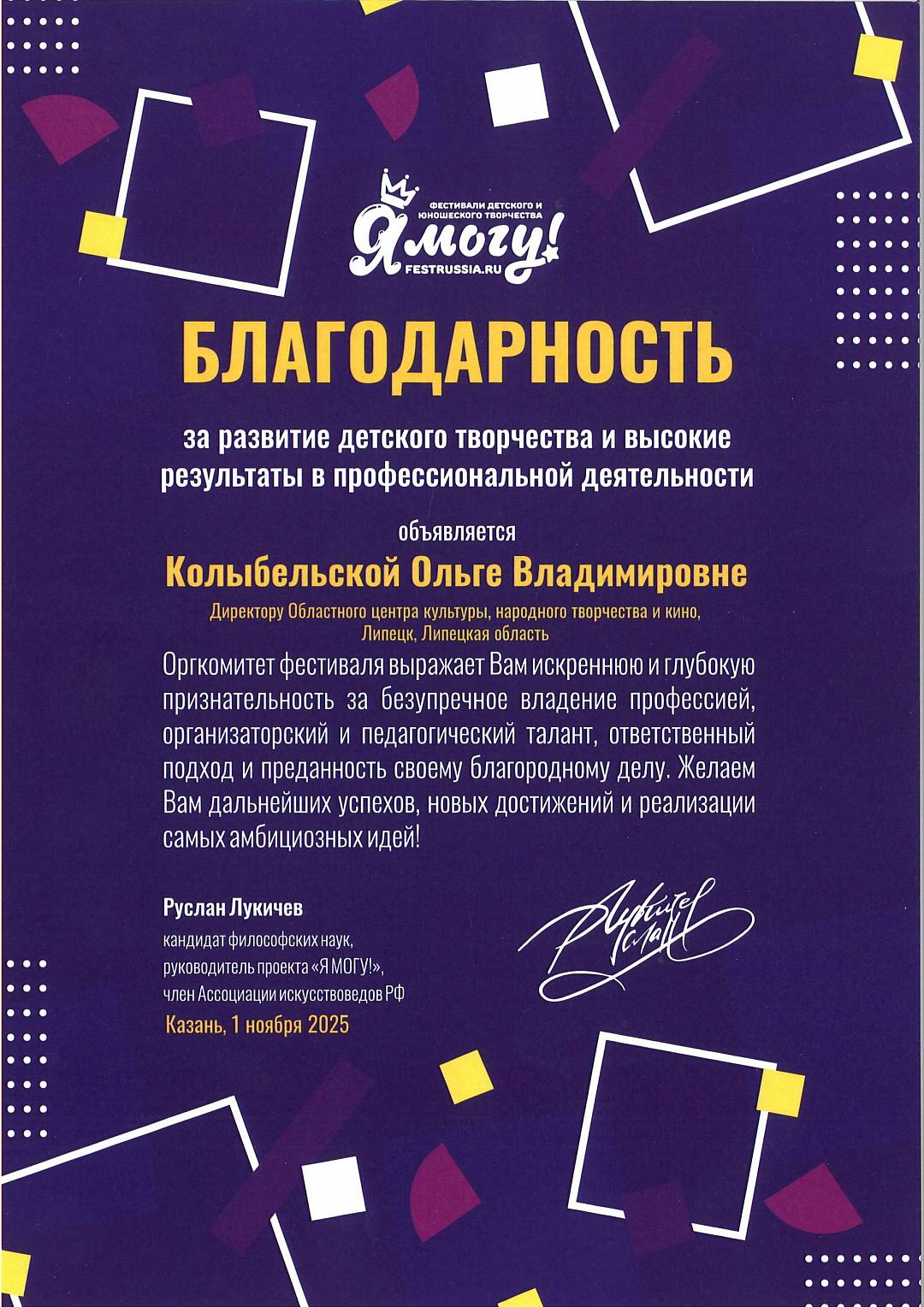 Директор ОЦКНТ Ольга Колыбельская была отмечена благодарностью за развитие детского творчества и высокие профессиональные результаты.