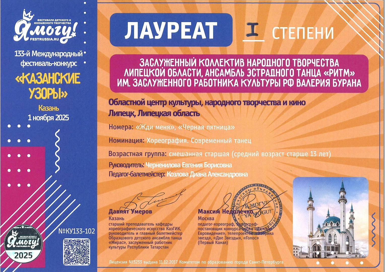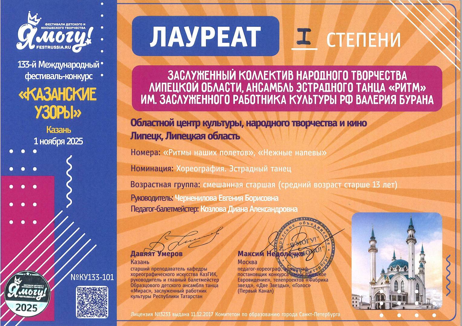 Заслуженный коллектив народного творчества, ансамбль эстрадного танца «Ритм» им. Валерия Бурана, выступил на том же престижном конкурсе и привез из Казани не один, а целый набор высших наград.