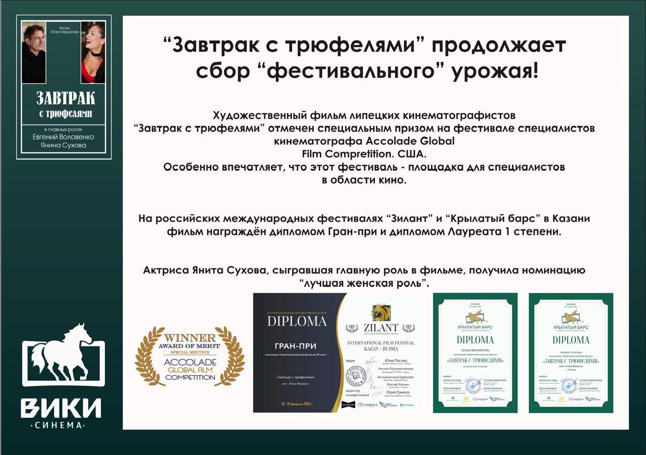 - Художественный фильм липецких кинематографистов «Завтрак с трюфелями» под руководством режиссера Игоря Федорова завоевал специальный приз на престижном фестивале Accolade Global Film Competition в США!