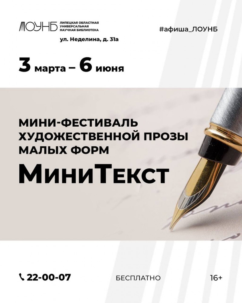 Все подробности на сайте библиотеки: https://lib48.ru/konkurs/mini-festival-khudozhestvennoj-prozy-malykh-form-minitekst
