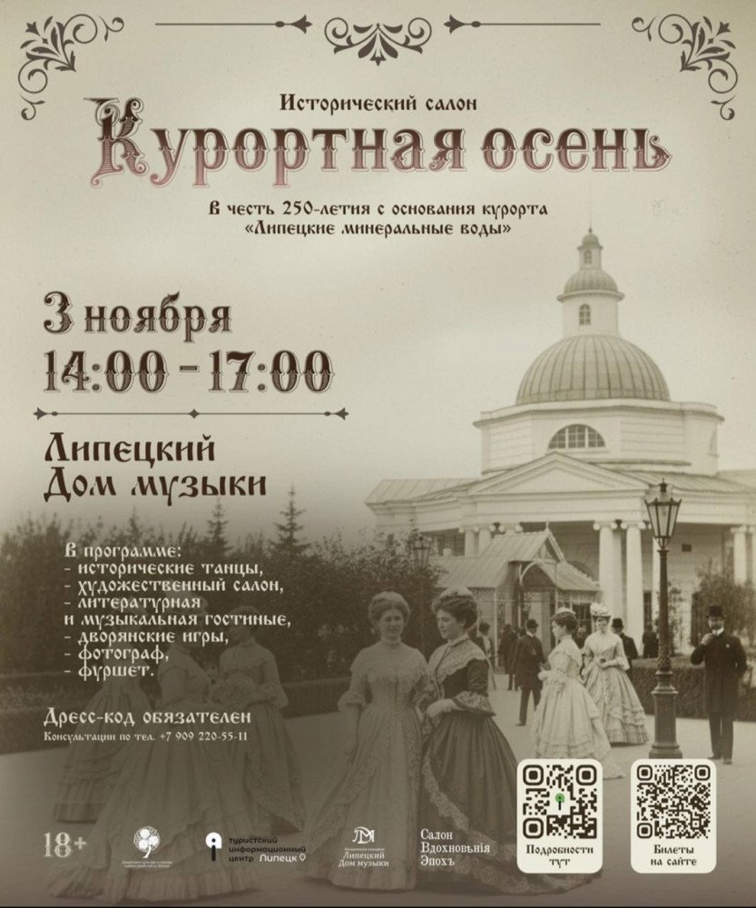 Представьте, что на один вечер Липецк снова становится модным курортом, куда съезжаются аристократы, поэты и музыканты. Именно это и ждёт гостей 3 ноября в Доме музыки на историческом салоне «Курортная осень». Повод более чем достойный — курорту «Липецкие Минеральные воды» 250 лет.
