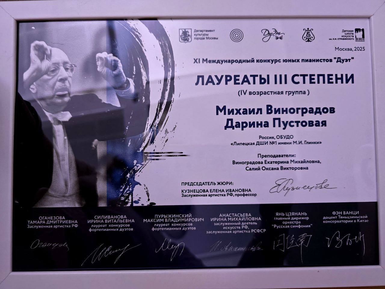 Дуэт Михаила Виноградова и Дарины Пустовой, учащихся Липецкой ДШИ им. М.И. Глинки» (преподаватели Екатерина Виноградова и Оксана Салий) , завоевал звание лауреатов III степени.