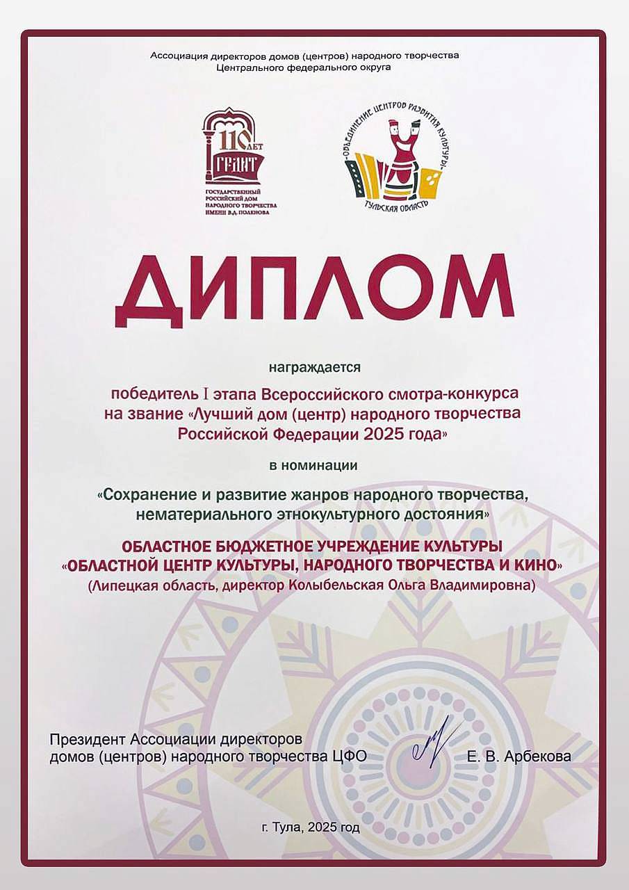 Липецкий областной центр культуры, народного творчества и кино (ОЦКНТ) одержал уверенную победу в конкурсе среди лучших учреждений культуры ЦФО. Он стал победителем I этапа Всероссийского смотра-конкурса на звание «Лучший дом (центр) народного творчества Российской Федерации 2025 года» в номинации «Сохранение и развитие народного творчества».
