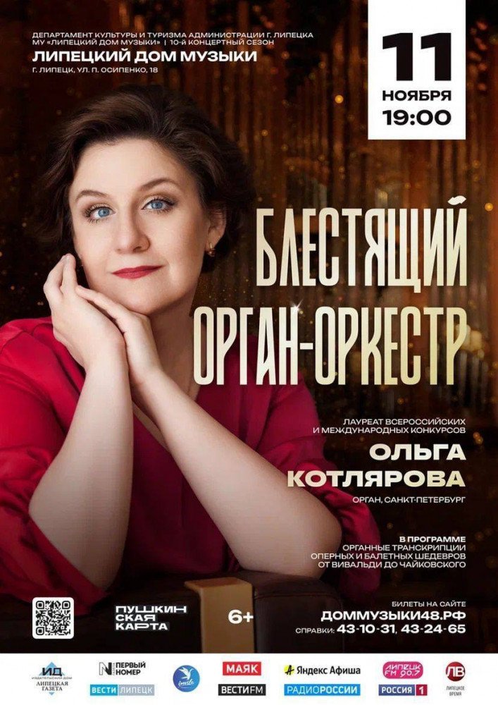 Ольга — солистка Мариинского театра, а это значит: готовьтесь к высшему пилотажу в исполнении и настоящему музыкальному спектаклю.Концерт «Блестящий орган-оркестр» — это билет в мир большой музыки, где все богатство звуков создает один-единственный инструмент.