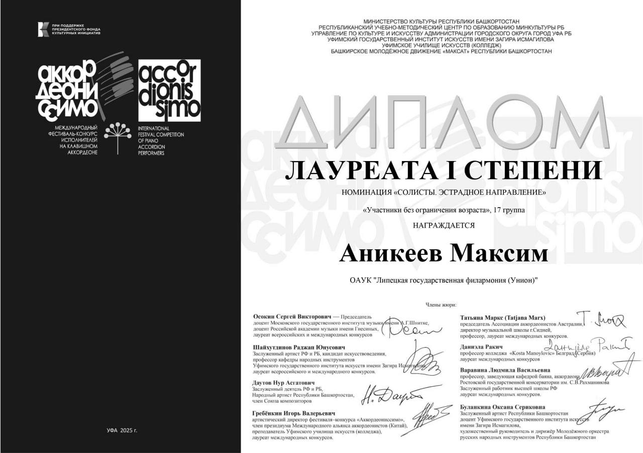 Аккордеонист Максим Аникеев стал лауреатом I степени на международном конкурсе «Аккордеониссимо» в Уфе.