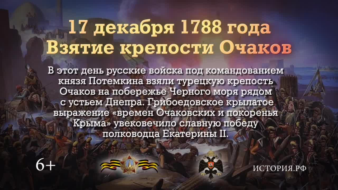 Памятная дата военной истории России. 17 декабря 1788 года русские войска под командованием князя Потемкина взяли турецкую крепость Очаков на побережье Черного моря рядом с устьем Днепра. Грибоедовское крылатое выражение «времен Очаковских и покоренья Крыма» увековечило славную победу полководца Екатерины II.