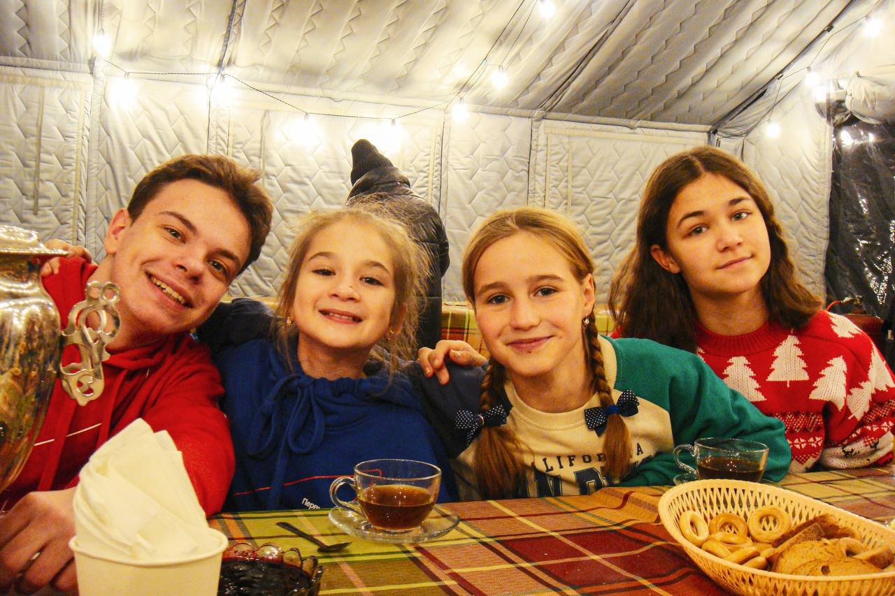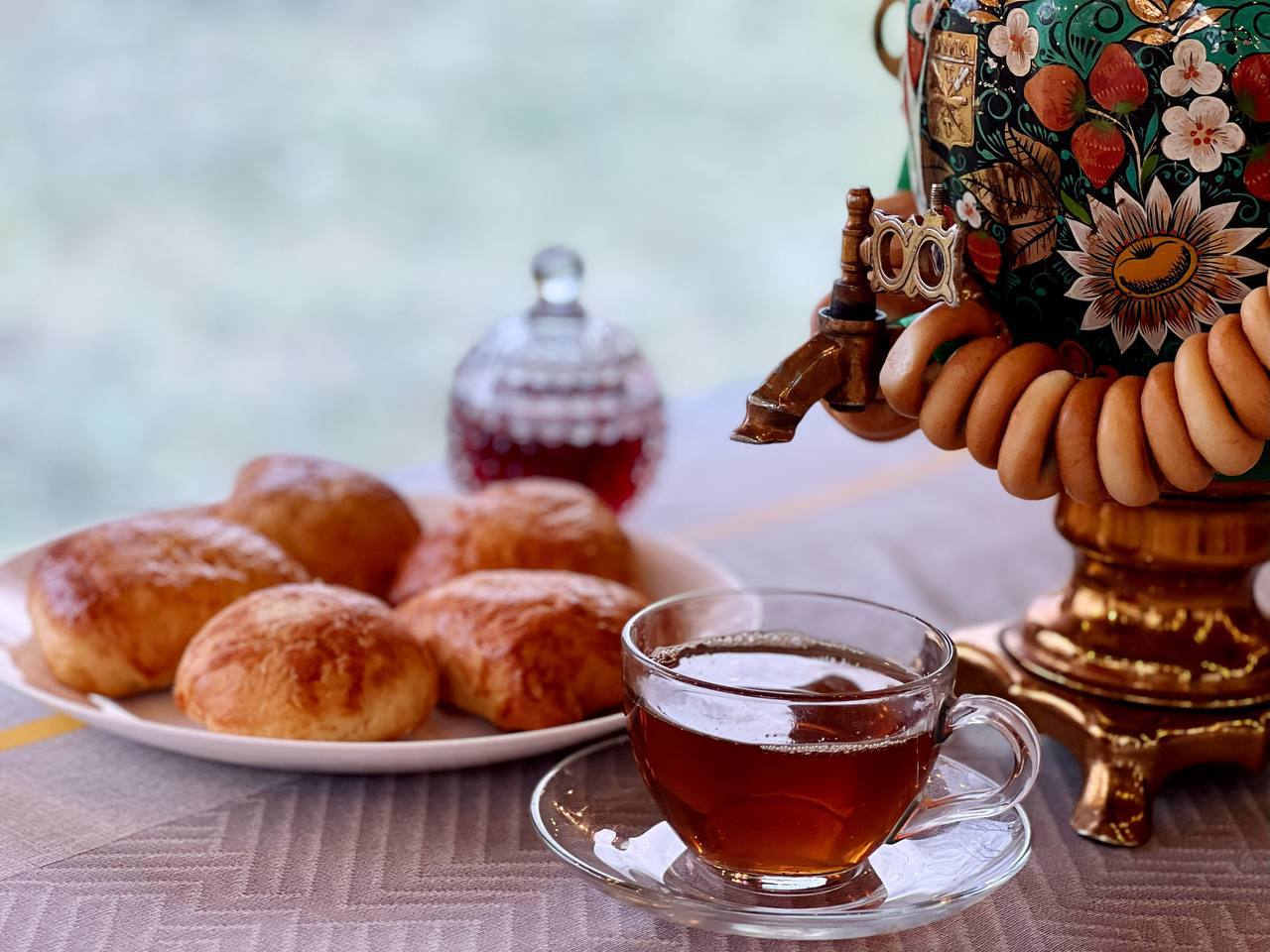 Угощение в тёплом шатре: чай из самовара, пироги, варенье.