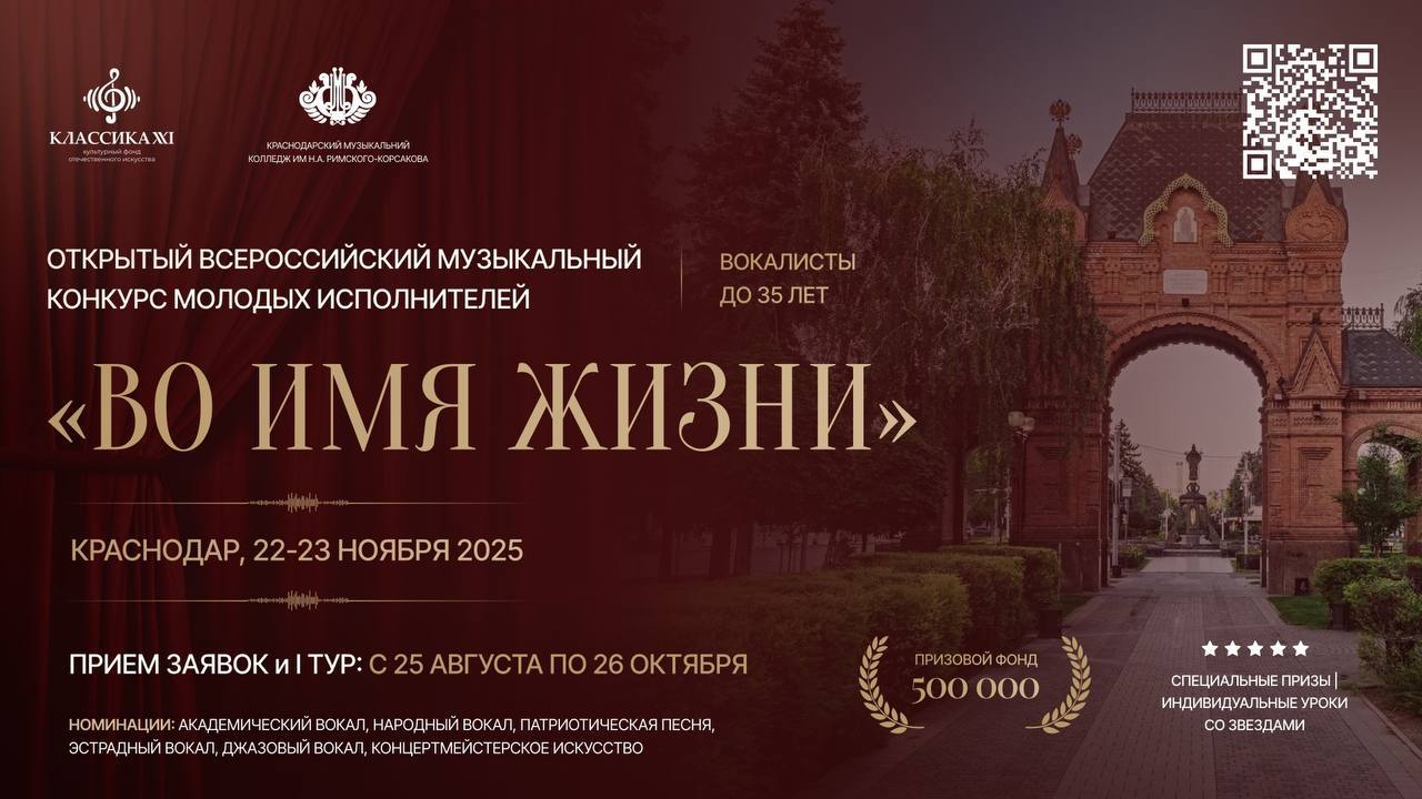 Открытый Всероссийский музыкальный конкурс молодых исполнителей «Во имя жизни», посвященный Году защитника Отечества! Состязание пройдет в II тура, финал состоится 22-23 ноября 2025 года в Краснодаре.