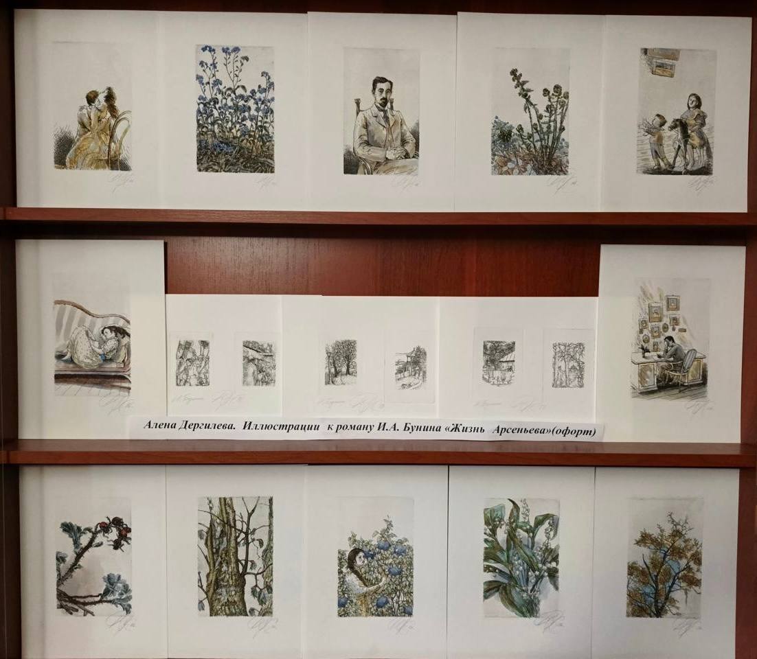 Заслуженный художник России, член-корреспондент РАХ Алёна Дергилёва передала Липецкому художественному музею эксклюзивный экземпляр книги Ивана Бунина «Жизнь Арсеньева» с оригинальными офортами, вшитыми между страниц. А 17 графических листов с иллюстрациями к роману теперь хранятся в фондах Литературно-мемориального музея И.А. Бунина в Ельце.