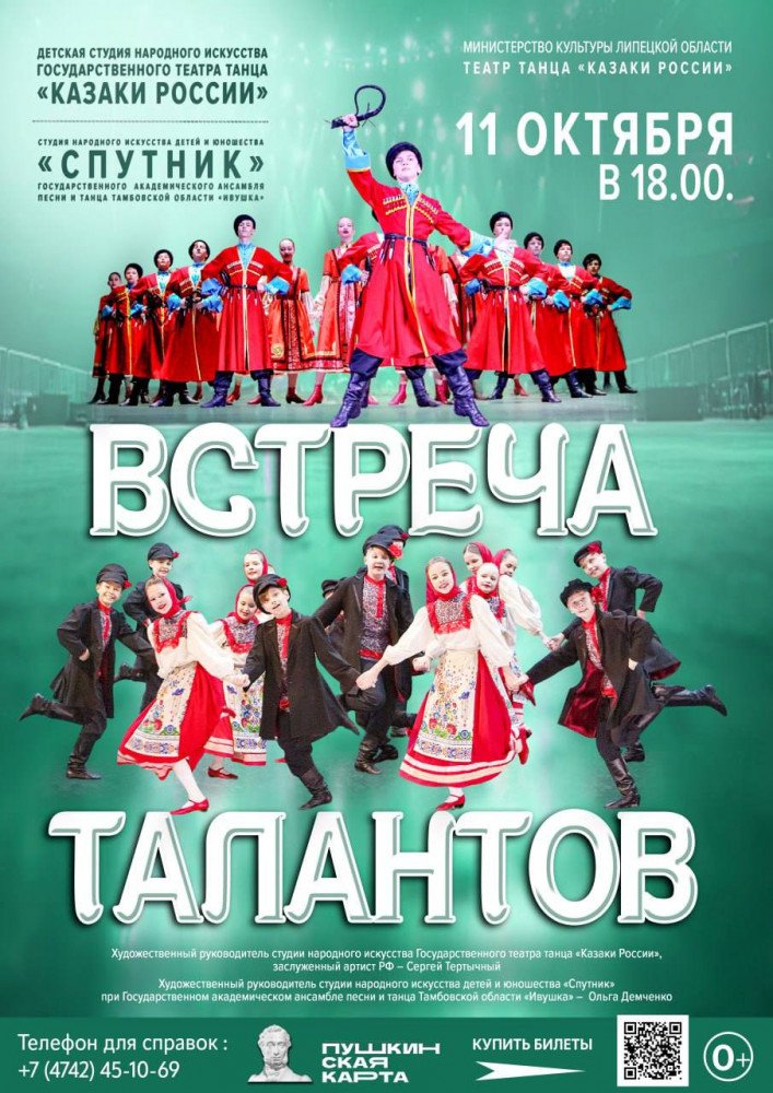 Свою совместную программу «Встреча талантов» представят студия народного искусства государственного театра танца «Казаки России» и студия народного искусства детей и юношества «Спутник» при государственном академическом ансамбле песни и танца Тамбовской области «Ивушка».