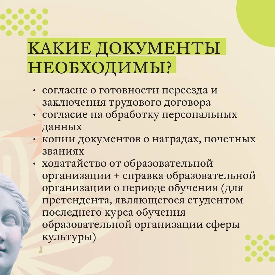 Единовременную выплату в размере 1 млн рублей получат представители сферы культуры, которые приедут работать в сельские населенные пункты, рабочие поселки и малые города с численностью населения до 50 тысяч человек.Условия программы: