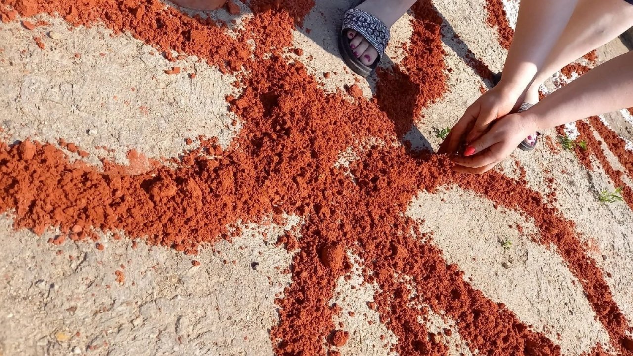 В народе этот обряд, корни которого уходят в глубину веков, называют «Дорога к богу». «Лесенка» из цветного песка означает связь поколений. Солярные символы - круг и ромб - солнце и урожай. Три цвета песка - белый, желтый и розовый - символизируют Троицу.
