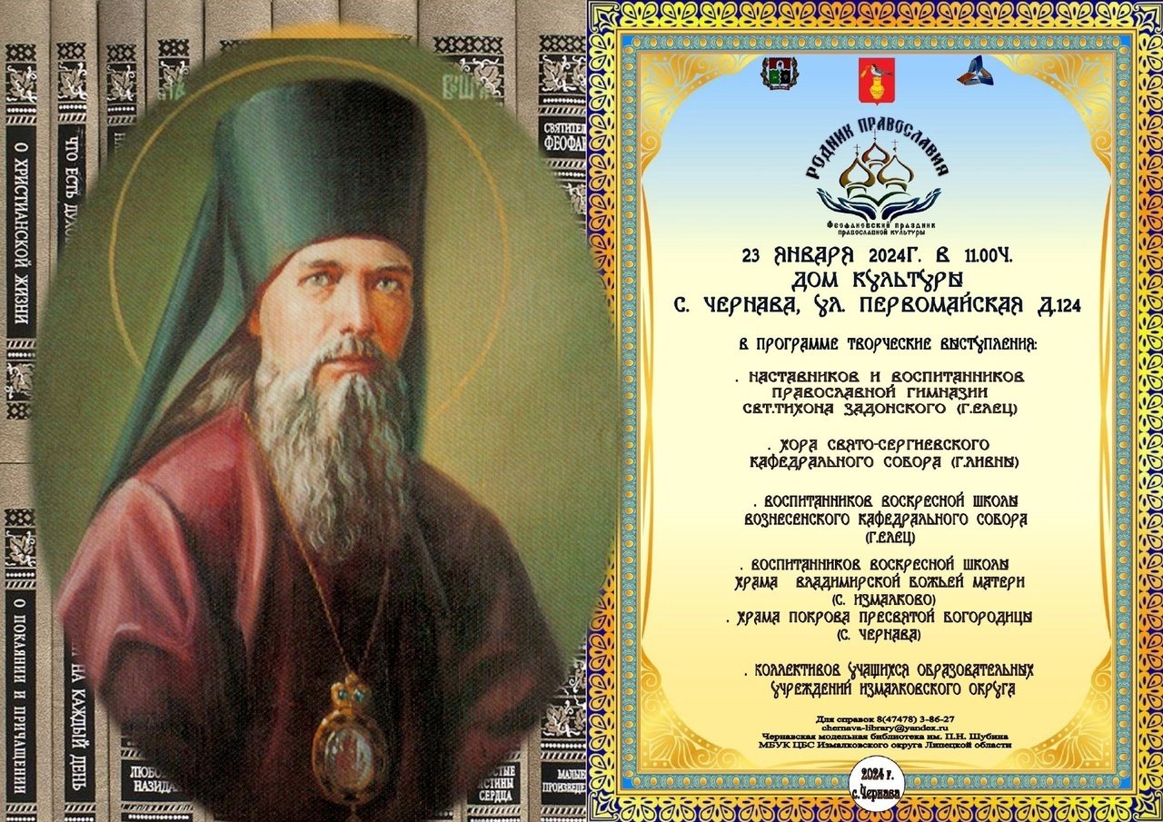 Феофановский праздник православной культуры «Родник православия» пройдет 23 января в 11.00 в здании Чернавского поселенческого центра культуры и досуга Измалковского округа. Он организован при участии сотрудников Чернавской модельной библиотеки имени П.Н. Шубина, созданной в рамках реализации федерального проекта «Культурная среда» национального проекта «Культура».