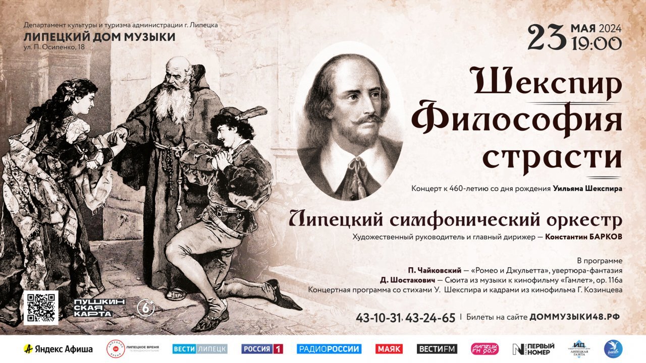 Концерт к 460-летию со дня рождения Уильяма Шекспира «Шекспир. Философия страсти» состоится 23 мая в 19.00 в Доме музыки. Выступит лауреат Всесоюзного и международных фестивалей – Липецкий симфонический оркестр. Художественный руководитель и главный дирижер – Константин Барков.