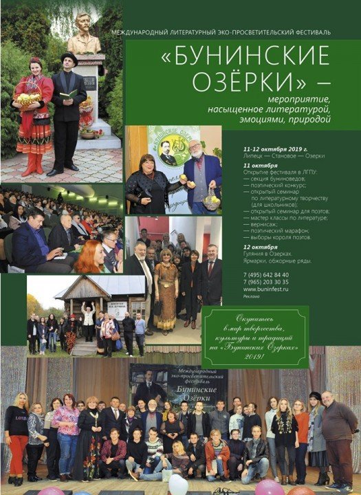 Мероприятие пройдёт в рамках международного литературного эко-просветительского фестиваля "Бунинские озёрки". Фестиваль пройдёт 11 и 12 октября. Его открытие состоится в ЛГПУ им. П. П. Семёнова-Тян-Шанского 11 октября. Пройдут мастер-классы по литературе, а также поэтический конкурс, семинар по литературному творчеству, поэтический марафон и многое другое.