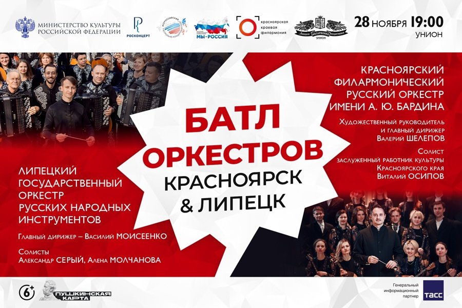 28 ноября в 19:00 в Липецкой государственной филармонии "УНИОН" состоится уникальный проект — совместное выступление двух коллективов: Красноярского филармонического русского оркестра им. А.Ю. Бардина под руководством Валерия Шелепова и Липецкого государственного оркестра русских народных инструментов под управлением Василия Моисеенко.