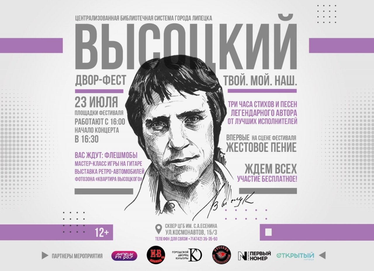 Межрегиональный двор-фест «Высоцкий: Твой. Мой. Наш» приглашает гостей. 23 июля (воскресенье) двор Центральной городской библиотеки им. С. Есенина (ул. Космонавтов,15/3) превратится в территорию искусства и творчества.