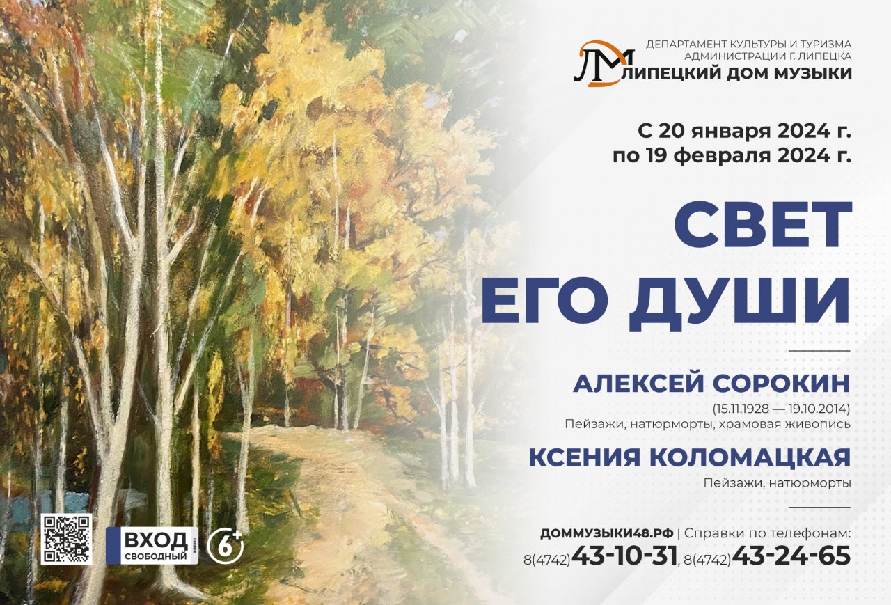 Выставка «Свет его души» пройдет в Доме музыки с 20 января по 19 февраля. В ней представлены 30 работ двух художников: Алексея Денисовича Сорокина (15.11.1928 – 19.10.2014 гг.) и его внучки Ксении Коломацкой. У живописцев различная манера письма, свой взгляд и стилистика. Объединяет одно: любовь к окружающему миру, тем незатейливым, но ясным проявлениям природы.