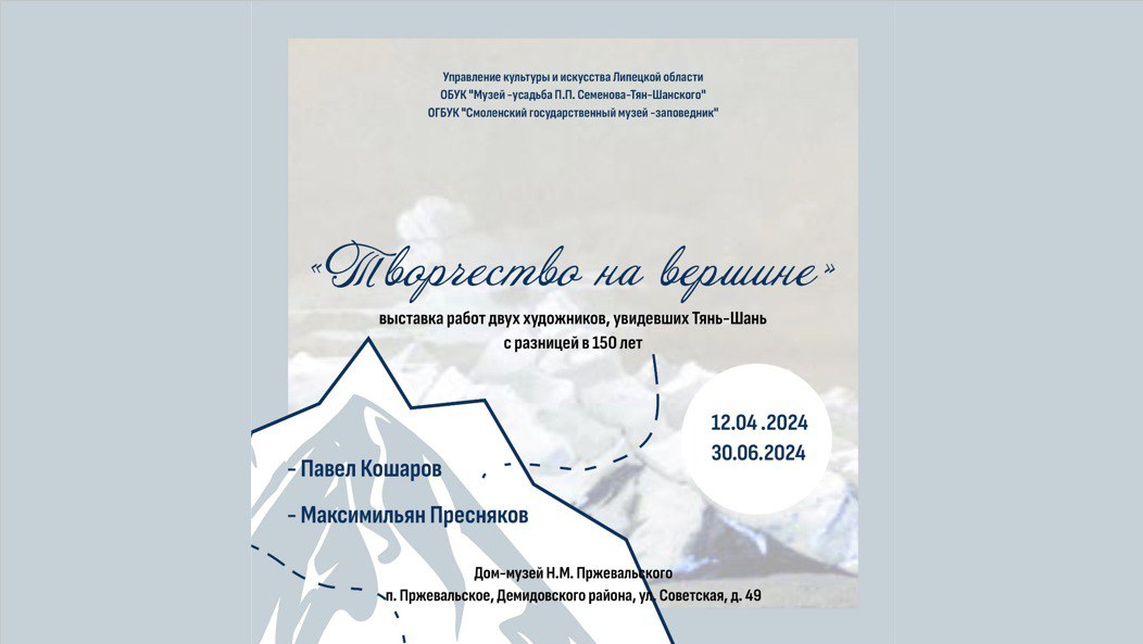 Художественная выставка музея-усадьбы П.П. Семенова-Тян-Шанского «Творчество на вершине» расскажет о двух экспедициях к величественным горам Тянь-Шань с разницей более чем в 150 лет. Ее открытие состоится 12 апреля в Смоленске.